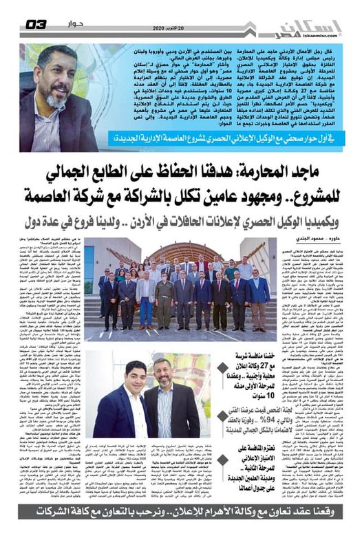 في اطار التعاون الكامل والمثمربين شركه العاصمة الاداريه للتنمية العمرانية وبين شركه ويكيميديا وذلك بناء على تعليمات رئيس مجلس الادارة والعضو المنتدب لشركة العاصمة الادارية للتنمية العمرانية فقد تقرر الزام كافة المشروعات القائمة في حي المال والاعمال وجميع المناطق وجميع المشروعات بانواعها على التعاقد مع شركة ويكيميديا لتركيب سياج اعلاني على اوجه الاراضي الخاصة بالمشروعات وذلك طبقا للنموذج المعتمد من شركة العاصمه
